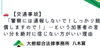 コラム 🚗【交通事故】 警察には通報しないで!しっかり賠償しますので!……という加害者の言い分を絶対に信じない方がいい理由 👥 登場人物ダイキ:交通事故にあった友人から相談を受けているたいじゅ先生:交通事故に詳しい、少しだけ優しい弁護士🧑🎓 ダイキ:「たいじゅ先生、友人が接触事故にあったらしいんですけど、相手が『警察に通報しないで!全部弁償するから!』と言って... 2025.11.20 コラム交通事故